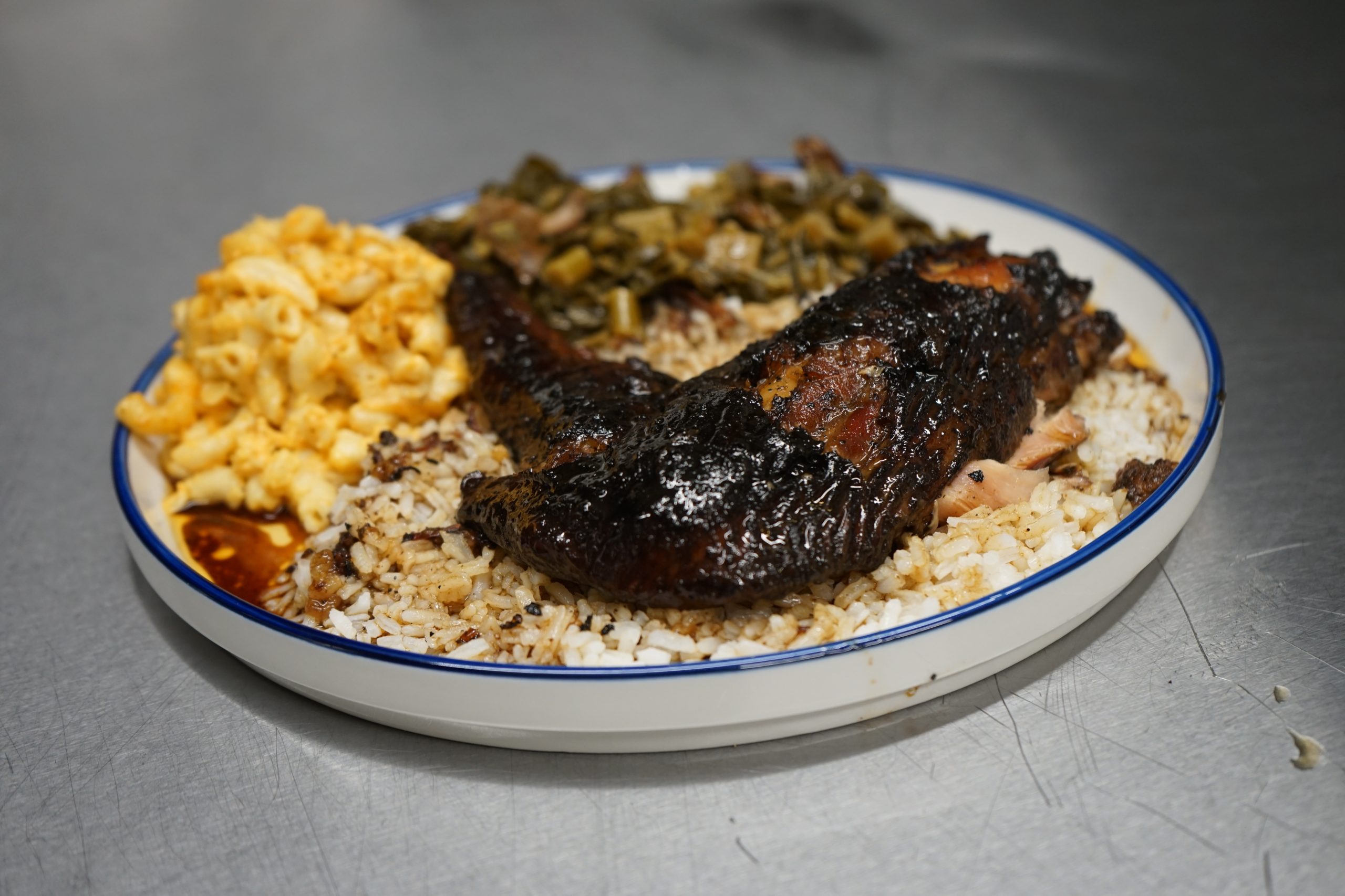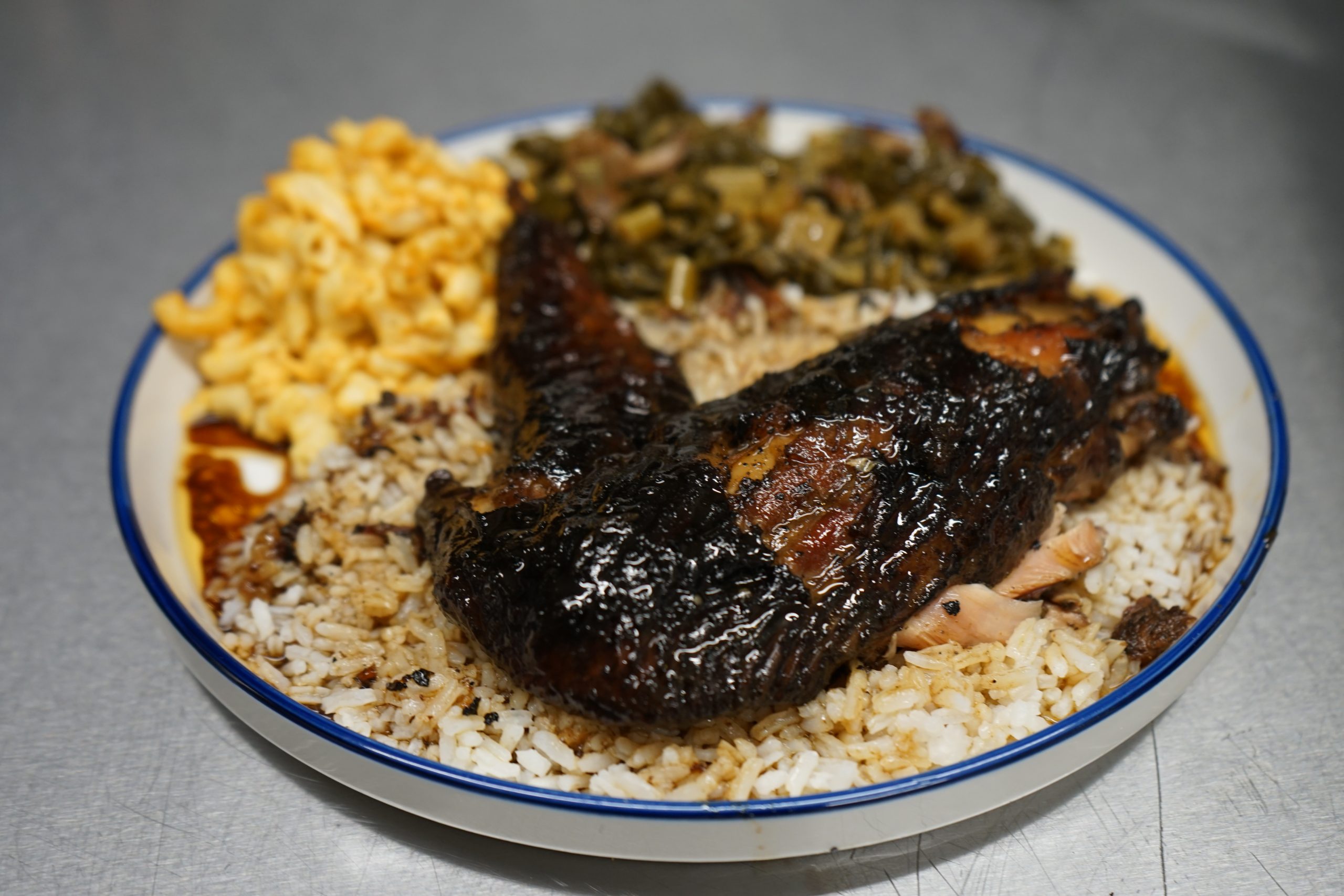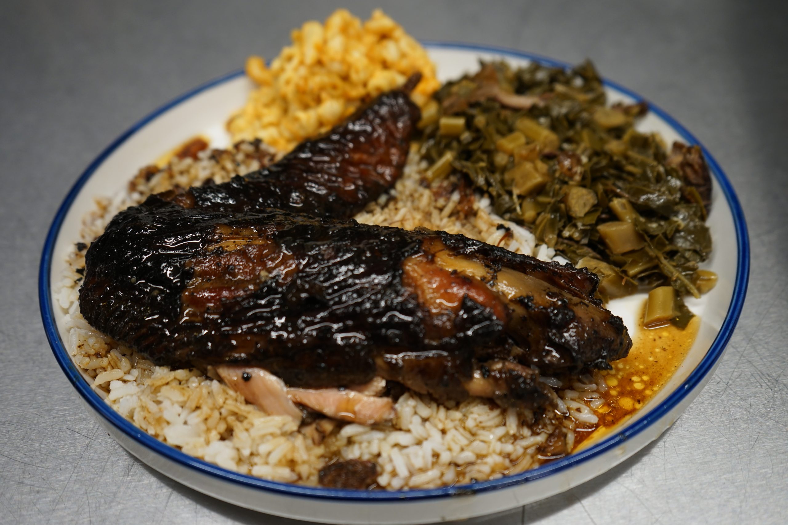 Flavorful smoked Turkey wings served with collard greens, mac & cheese